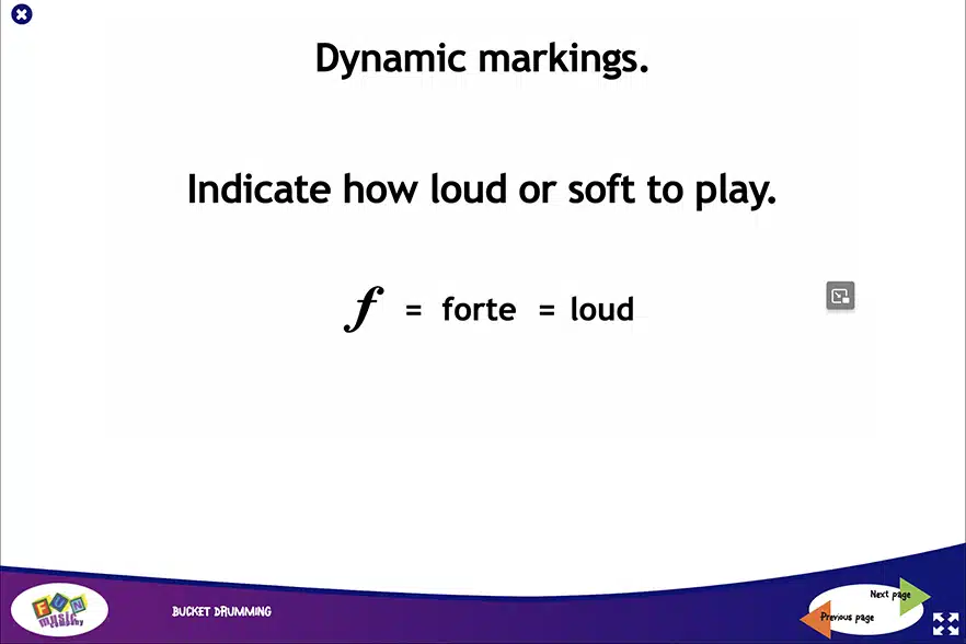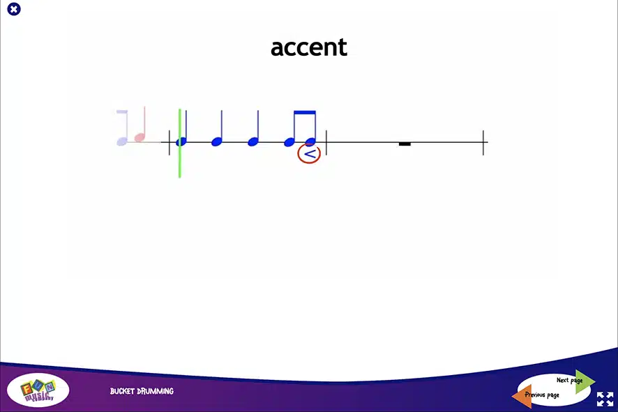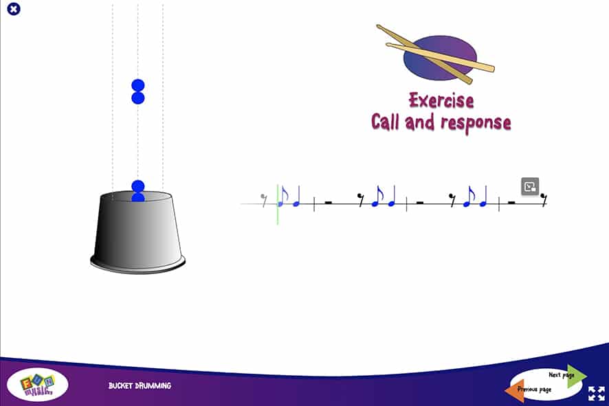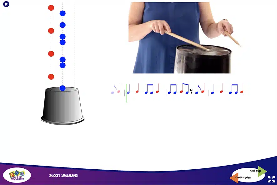 Unique bucket drumming animations, so you can show the students what to play in a familiar game-like style.