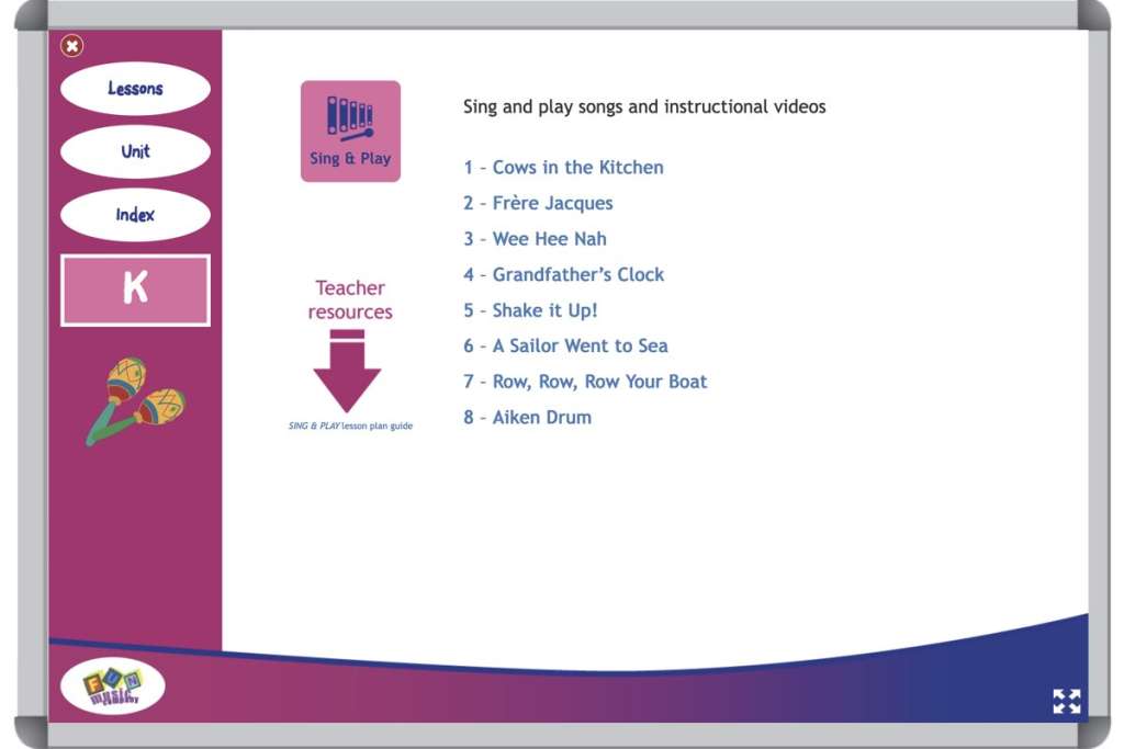 Every lesson contains a SING & PLAY song, and children learn the song in a consistent way for five lessons. Each song contains singing, playing untuned rhythm instruments and playing tuned instruments.