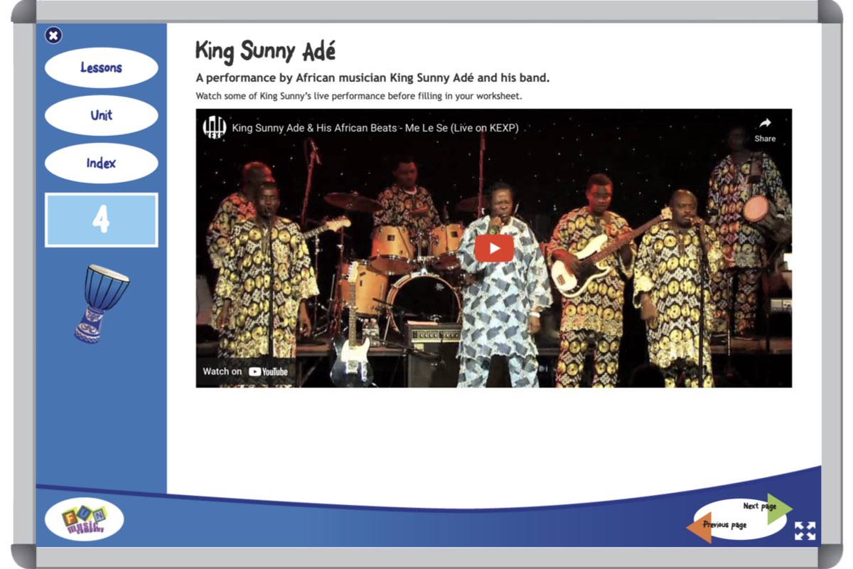 There are videos showing each step of the process, from the introduction to the song through to playing as a classroom ensemble.